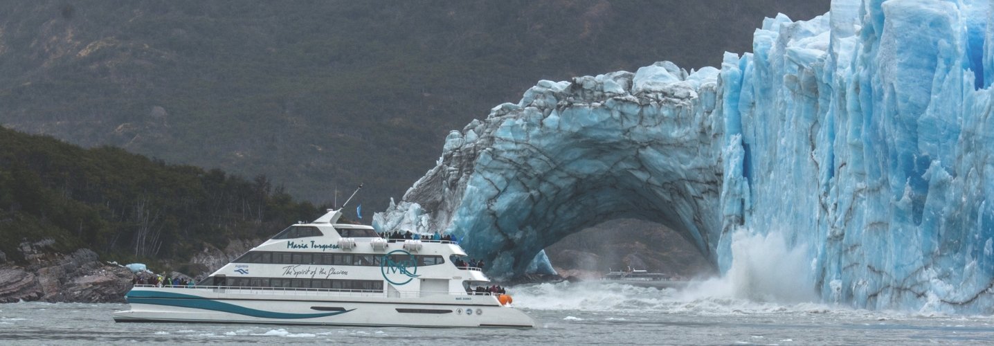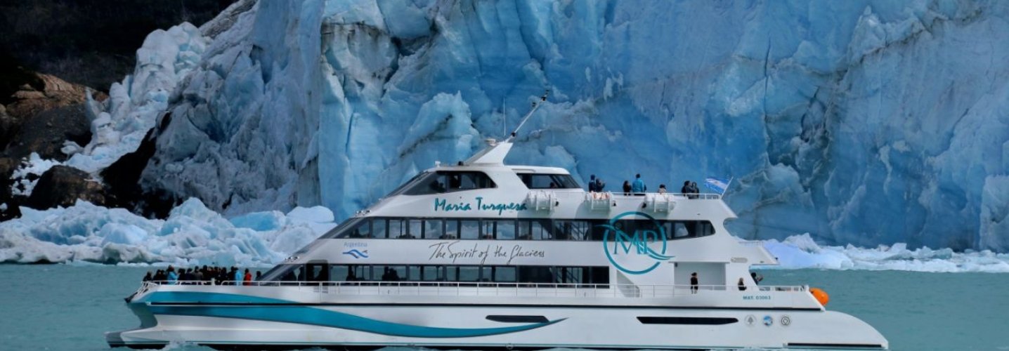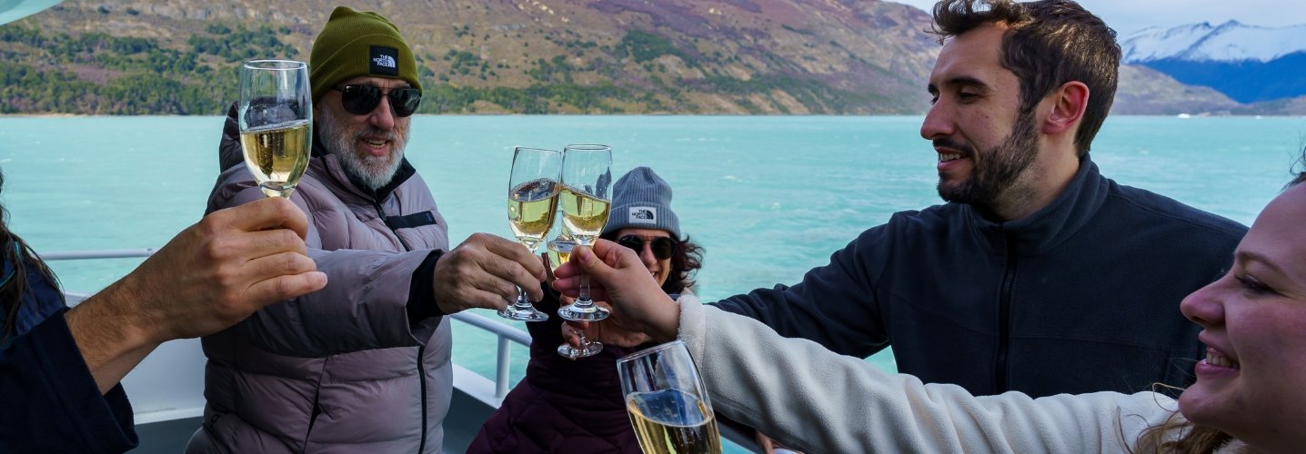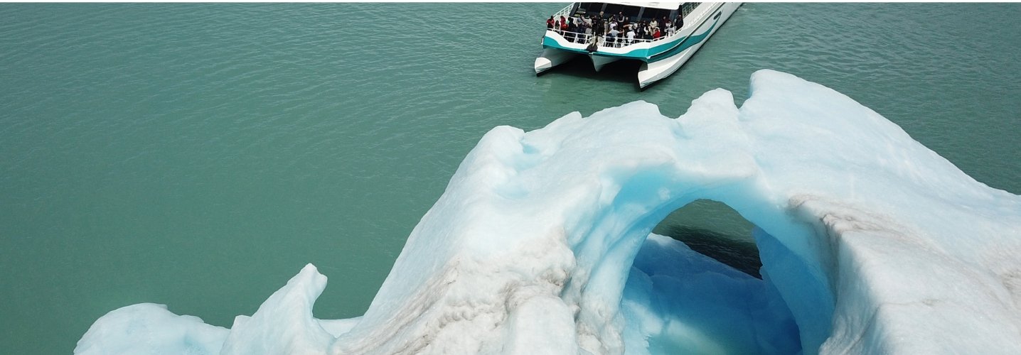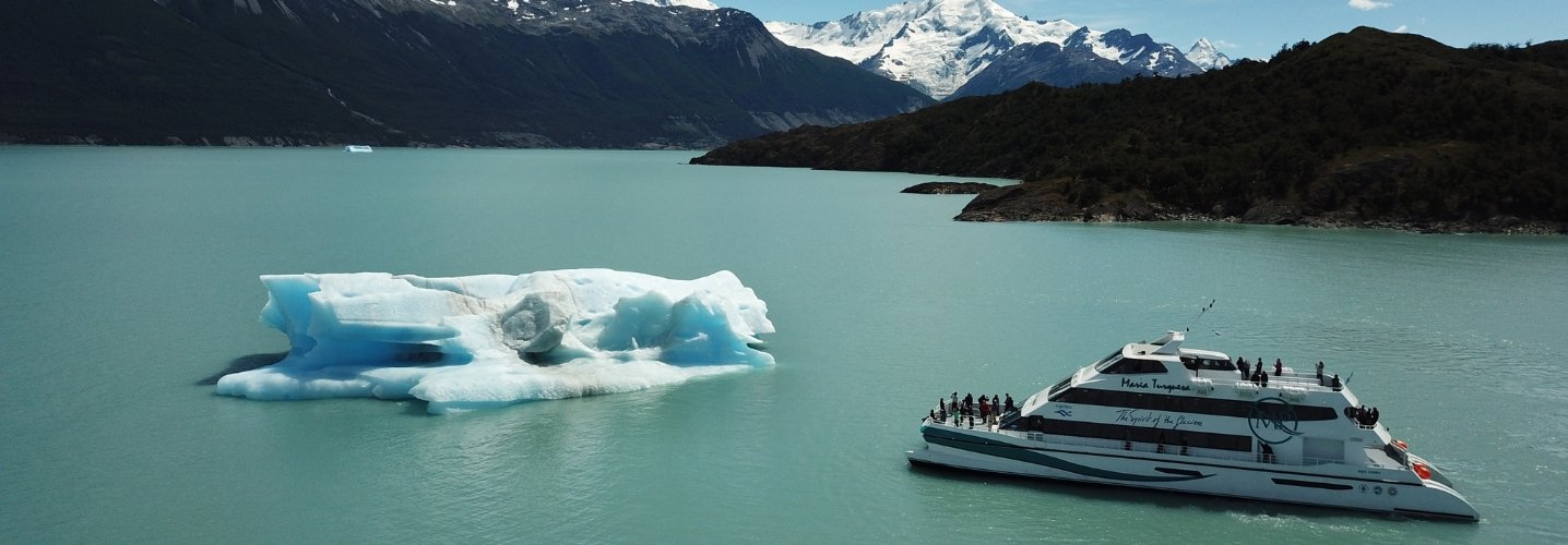 Partimos de un puerto privado en el Lago Argentino rumbo noroeste, navegando por la Boca del Diablo, de 800 metros de ancho. Avistamos Punta Avellaneda...